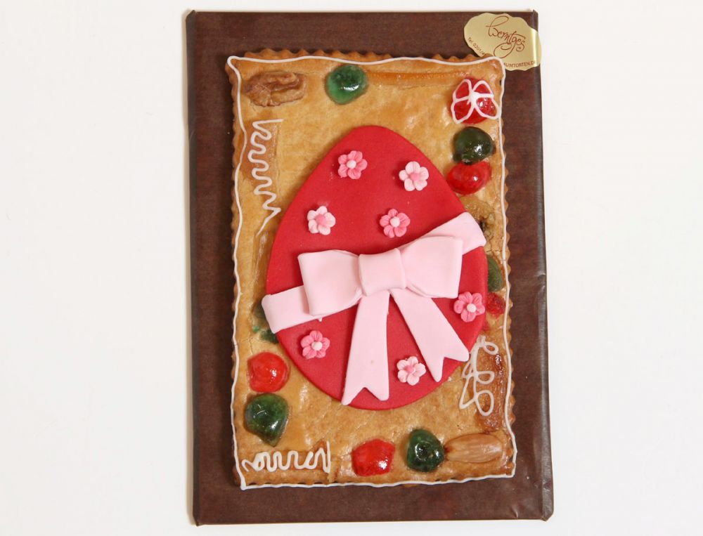 Dekoriert mit einem Ei mit Schleife aus Marzipan, Fondant und Schokolade.