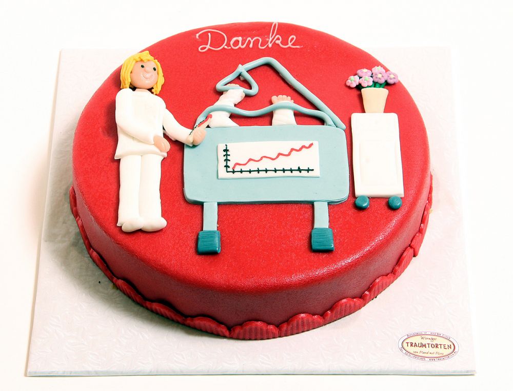 Diese runde Torte greift mit einer plastisch gestalteten Szene aus dem Klinikalltag das Thema „Auf dem Weg nach oben“ auf. Eine Figur in weißer Berufskleidung steht neben einem Krankenbett mit Monitoranzeige, Infusionsständer und Blumen. Der Schriftzug „Danke“ setzt dabei einen persönlichen und wertschätzenden Akzent.