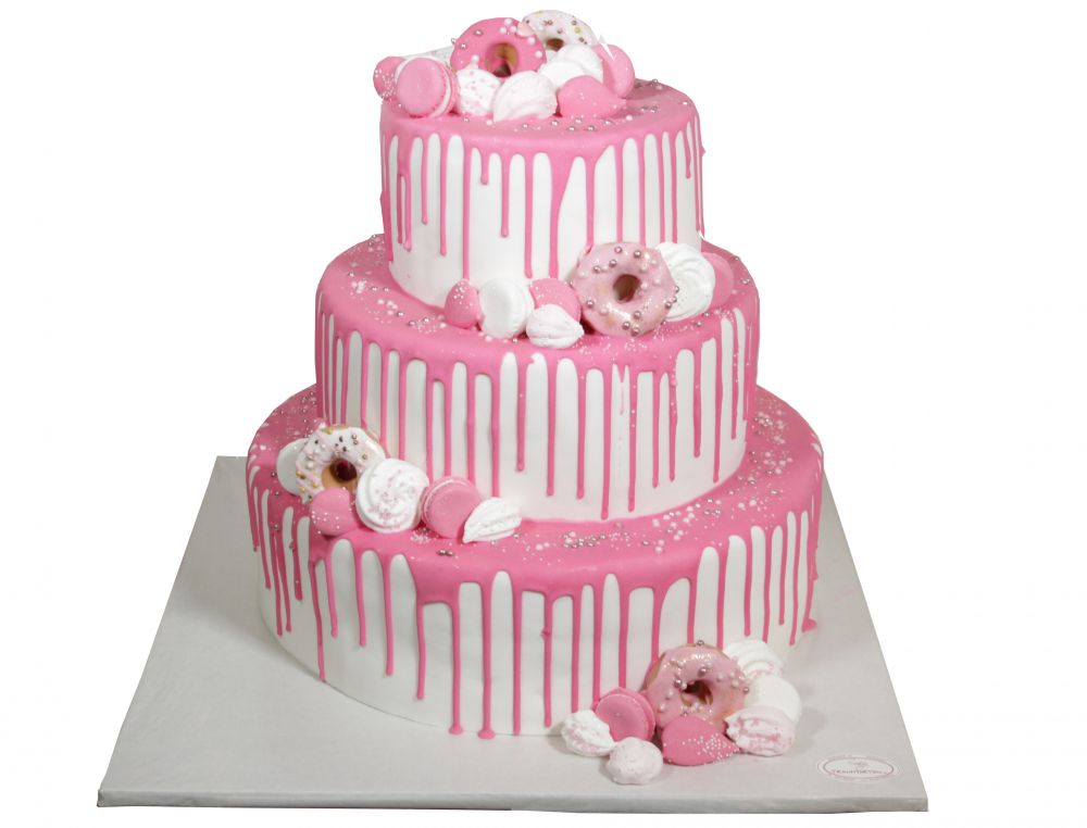 Charakteristisch für diese Torte ist die auffällige Kombination aus pinkem Drip, Donuts, Macarons, Baiser und feinen Nonpareils. Die Dekoration ist locker verteilt und wirkt bewusst nicht streng oder symmetrisch. Gerade dieses Zusammenspiel macht den besonderen Reiz aus: Der Drip Cake wirkt farbenfroh, modern und ein wenig verspielt, ohne seine klare Form zu verlieren.
