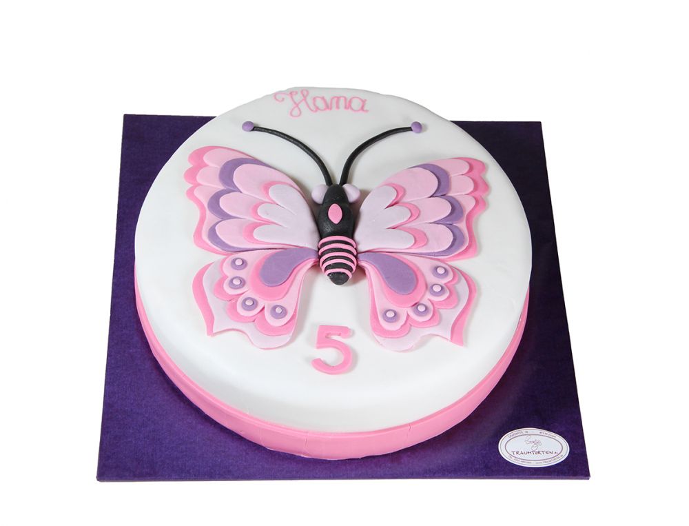 Schau mal! Ein großer Schmetterling hat sich auf der Torte niedergelassen. Mit rosa und lila Flügeln strahlt er und macht den Geburtstag gleich noch schöner. Fast sieht es so aus, als würde er gleich losflattern.