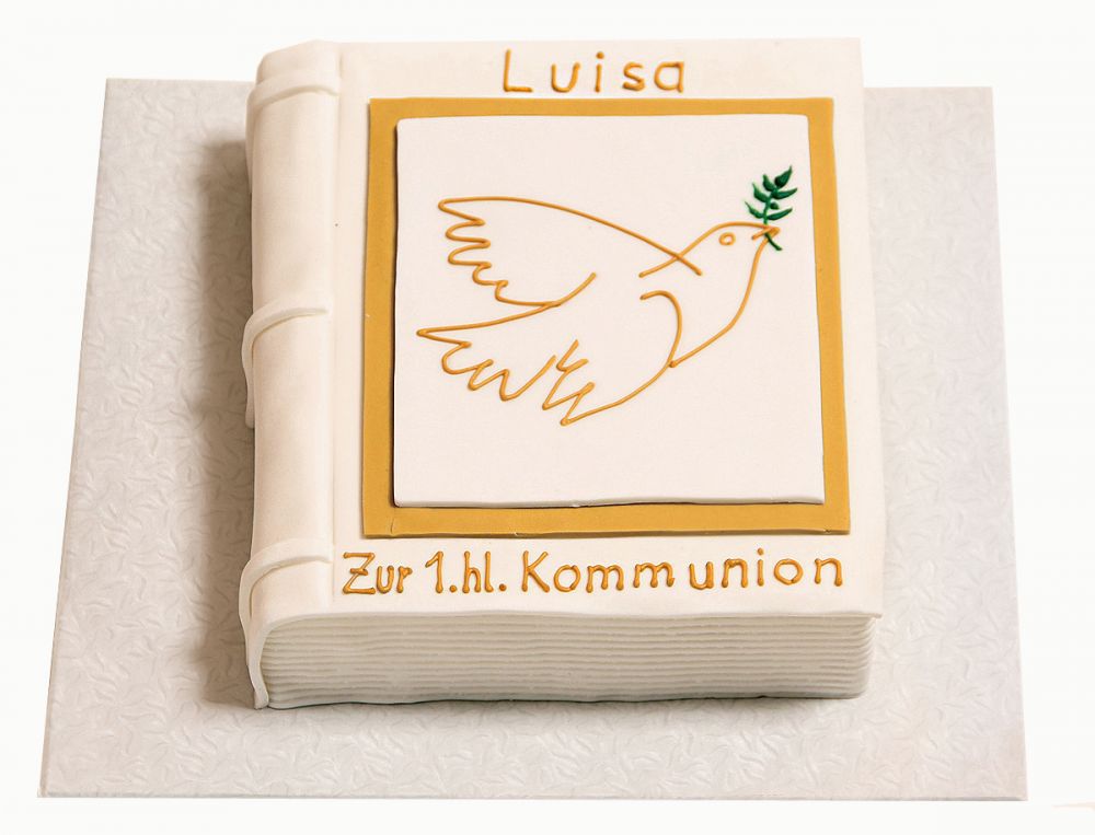 Diese Torte vermittelt dem Kommunion- oder Konfirmationskind schon beim ersten Blick die Bedeutsamkeit des Moments. Die ruhige Buchform, der helle Fondantüberzug und die klare Gestaltung wirken gesammelt und wertig, ohne streng zu sein. Die fein gezeichnete Taube mit dem kleinen Ölzweig verleiht dem Motiv Leichtigkeit und sorgt dafür, dass die Torte feierlich, aber zugleich freundlich und zugänglich erscheint.