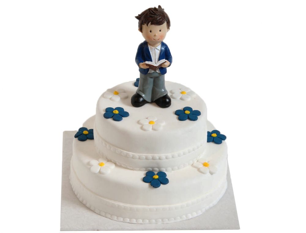 Klar, festlich und ruhig aufgebaut präsentiert sich diese zweistöckige Kommunionstorte in klassischem Weiß. Die blau-weißen Blüten setzen gezielte Akzente und rahmen die stehende Jungenfigur, die mit einem Buch in den Händen den Mittelpunkt bildet. Beim Überreichen wirkt die Torte gesammelt und wertig und macht dem Kommunionkind deutlich, dass dieser Tag bewusst gefeiert wird.