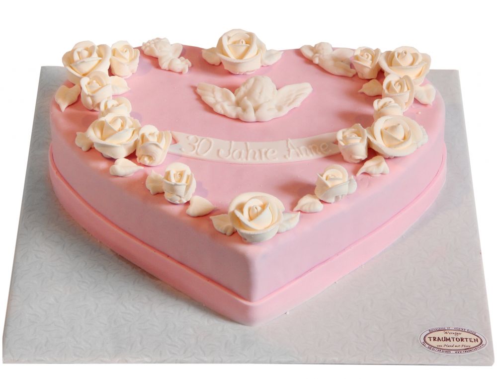 Zarte Rosen umrahmen diese herzförmige Torte und lenken den Blick sofort auf ihre liebevolle Gestaltung. Die klare Herzform wirkt weich und ausgewogen, während der glatte Fondantüberzug in sanftem Rosé der Torte eine ruhige, elegante Ausstrahlung verleiht. Die fein modellierten Rosen und kleinen Blätter aus Fondant sind harmonisch arrangiert und unterstreichen den wertigen Charakter dieser zurückhaltend gestalteten Torte.