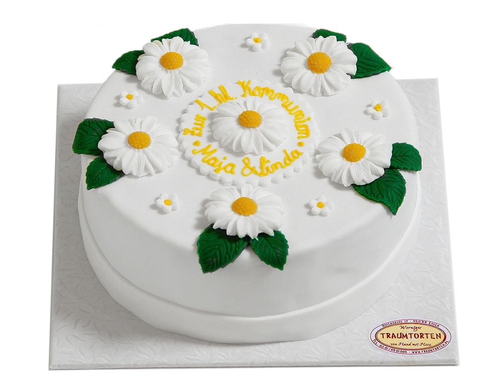 Frische Margeriten bestimmen das Erscheinungsbild dieser runden Torte und verleihen ihr eine helle, freundliche Ausstrahlung. Die glatte Oberfläche ist vollständig mit weißem Fondant überzogen und wirkt ruhig und klar. Die von Hand modellierten Margeriten mit ihren gelben Blütenmitten und grünen Blättern setzen lebendige Akzente, ohne die schlichte Gesamtwirkung zu stören. Der feine Schriftzug zur heiligen Kommunion fügt sich harmonisch in die Gestaltung ein und rundet das Bild ausgewogen ab.