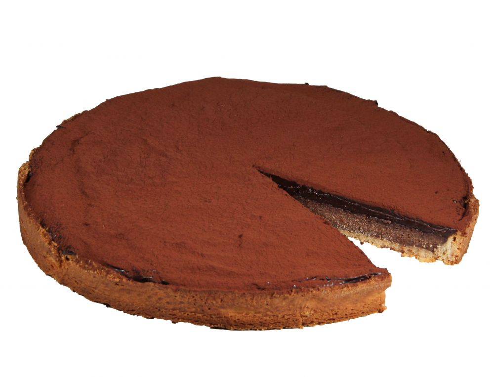Die Tarte besteht aus einer reichhaltigen Schokoladenfüllung in zwei Schichten, die durch eine feine vegane Ganache ergänzt werden. Der knusprige Mürbteigboden sorgt für Stabilität und einen angenehmen Kontrast zur cremigen Füllung, während eine zarte Schicht Kakaopulver die Tarte optisch und geschmacklich abrundet.