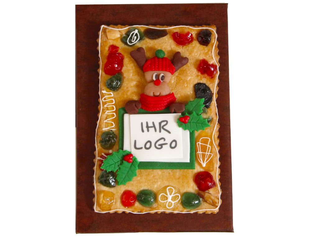 Diese Gebäckplatte verbindet den lockeren Wintercharakter des Elchs mit einer klaren Logo-Einbindung. Dadurch eignet sie sich besonders für Firmenpräsente, die weniger formell und etwas sympathischer auftreten sollen.